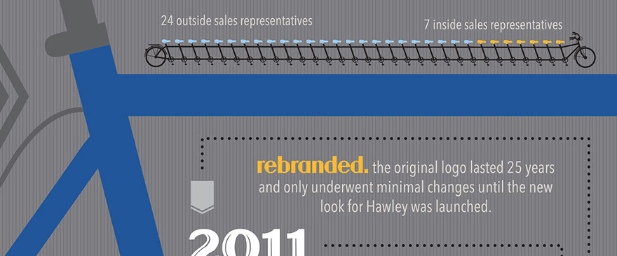 Hawley, LLC is a nationwide wholesaler of bicycle parts and accessories located in Lexington, SC. Their yearly catalog consists of 750 pages of the company's new and existing products for the year. This cover design uses infographic-style typography and creative elements to portray data from Hawley's history, staff, and products.