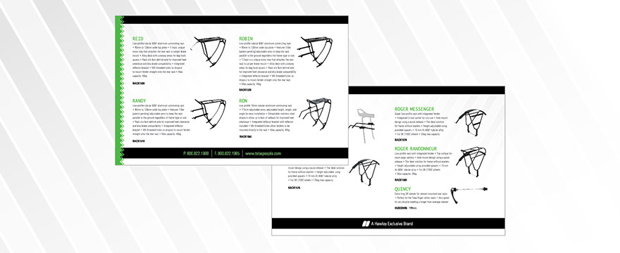 Toba and O2 are cycling brands sold exclusively by Hawley, LLC, a nationwide bicycle parts and accessories distributor located in Lexington, SC. Both brands offer affordable and versatile products. These cost-efficient mini catalogs are meant to be consistent with the respective company's brand standards and keep buyers up to date with the latest products.